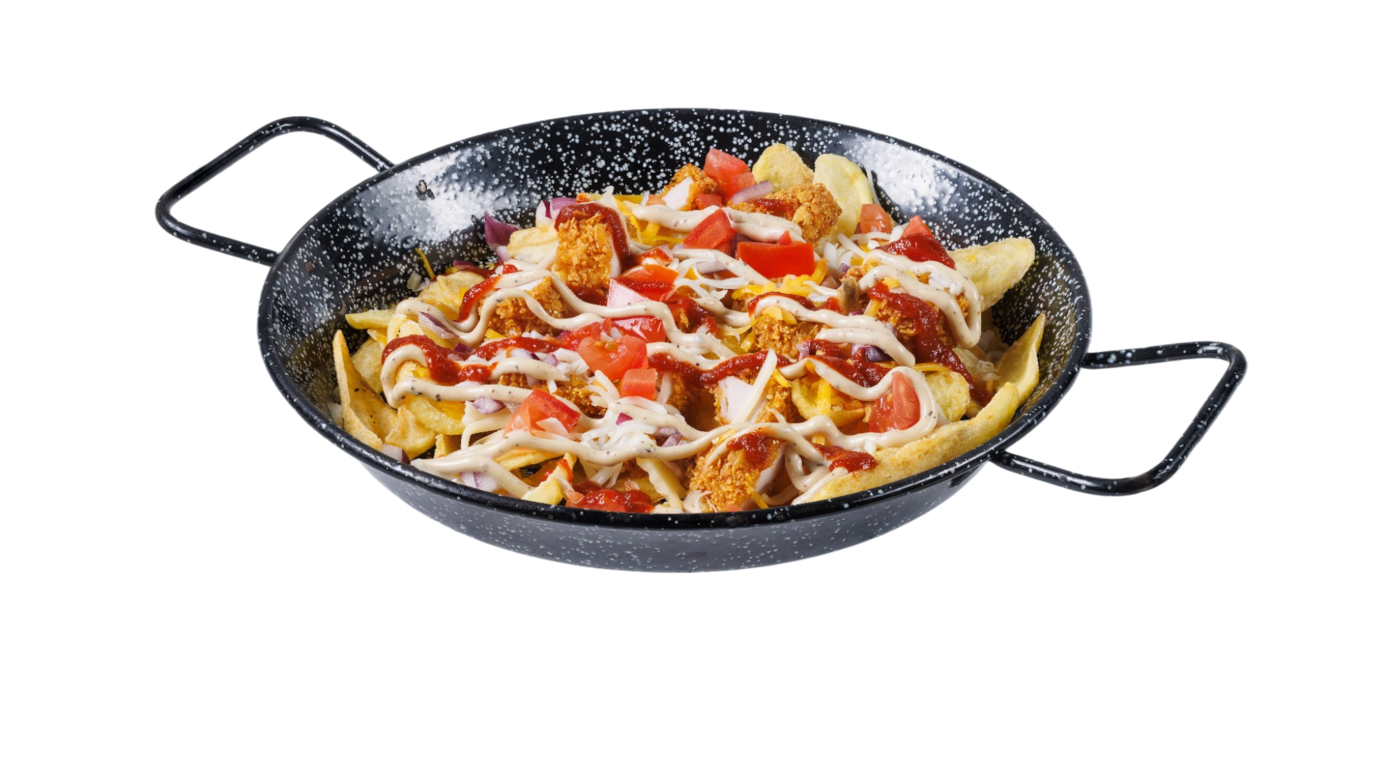 (Csónakburgonya, Super Crispy csirkemell, American Cheddar Cheese, mozzarella, paradicsom, lialhagyma, Bacon Mayo, Chipotle szósz)