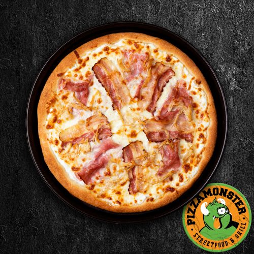 (tejfölös-fokhagymás alap, sonak, bacon, csirkemell, mozzarella)